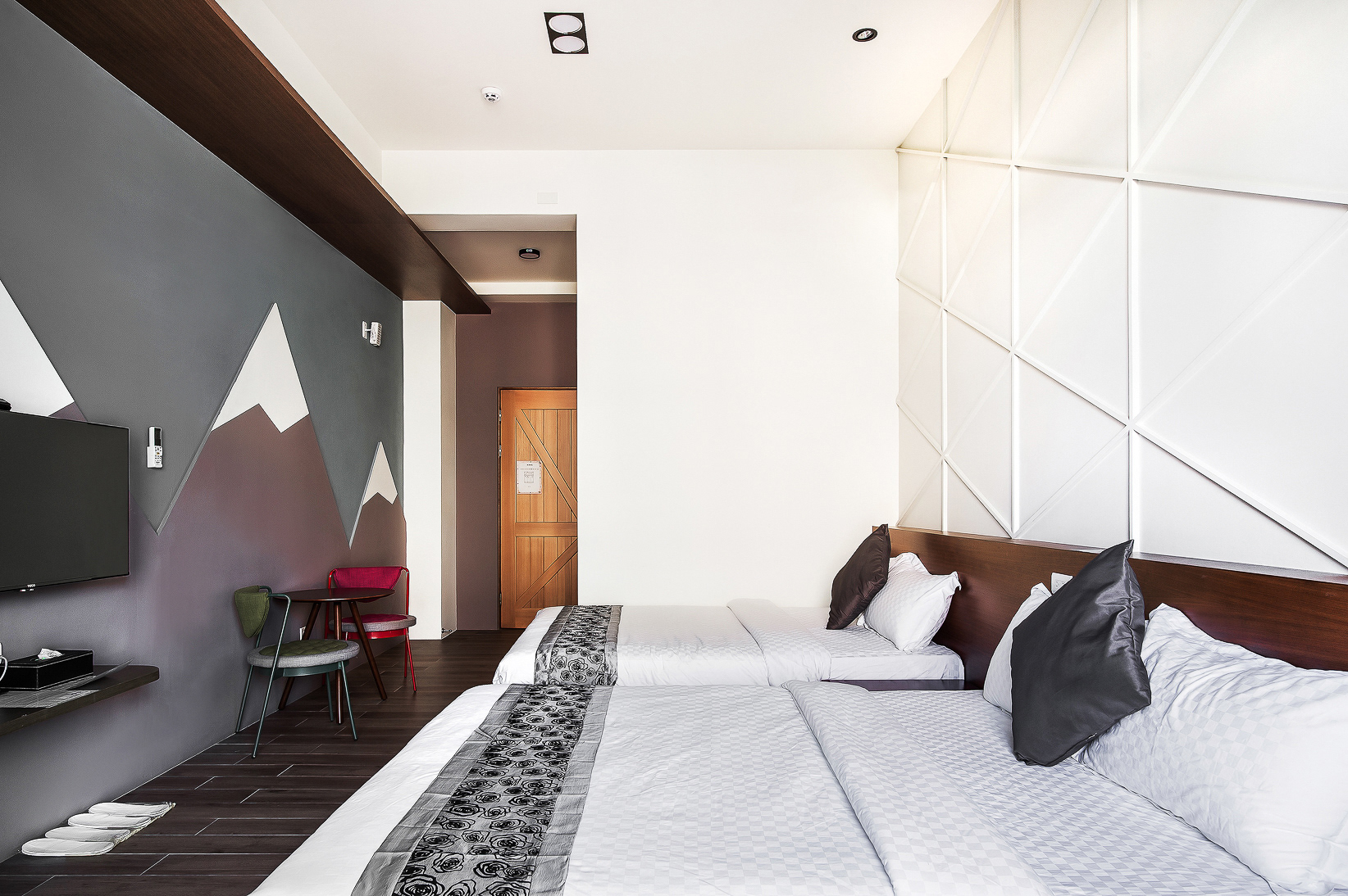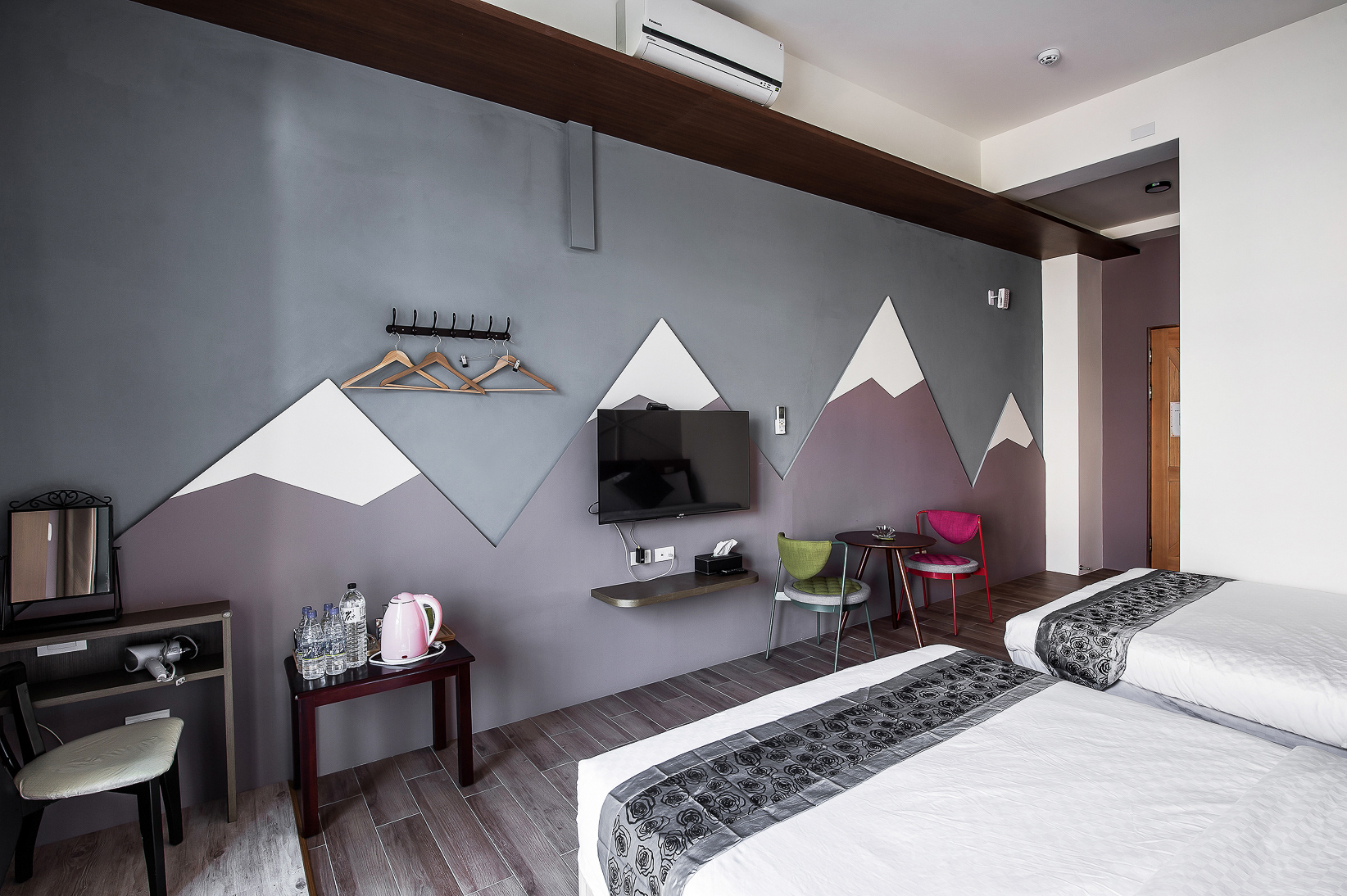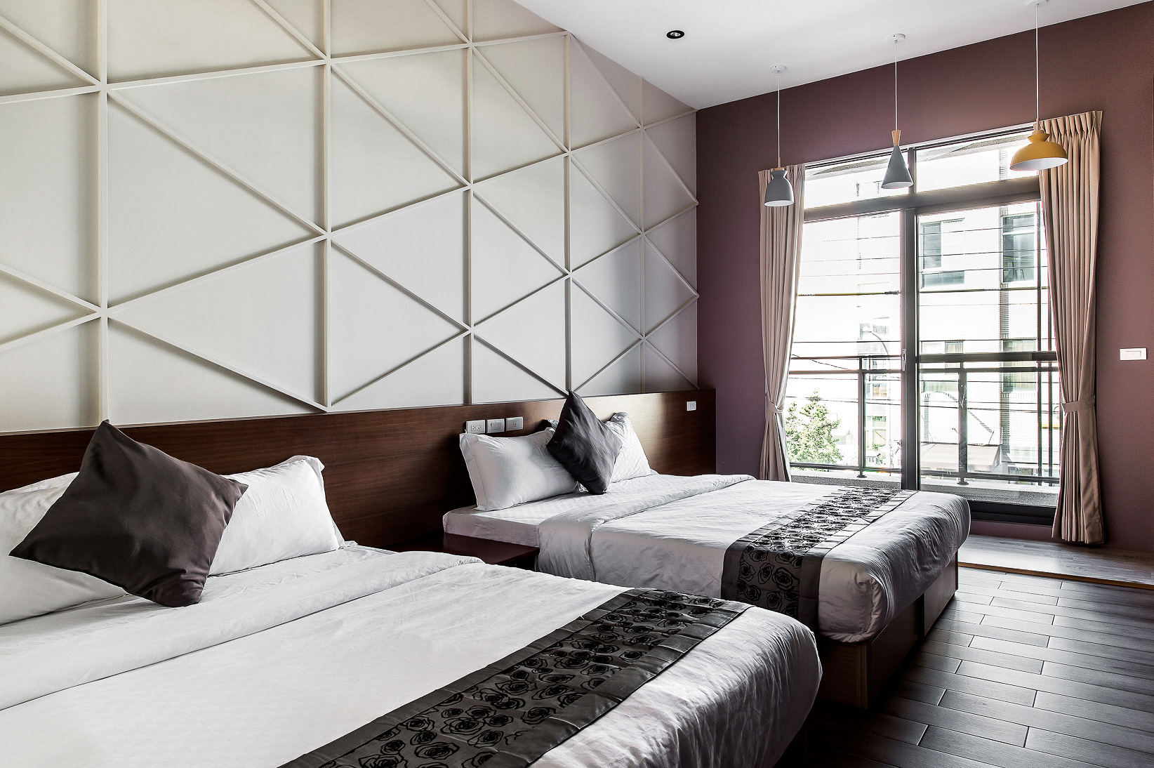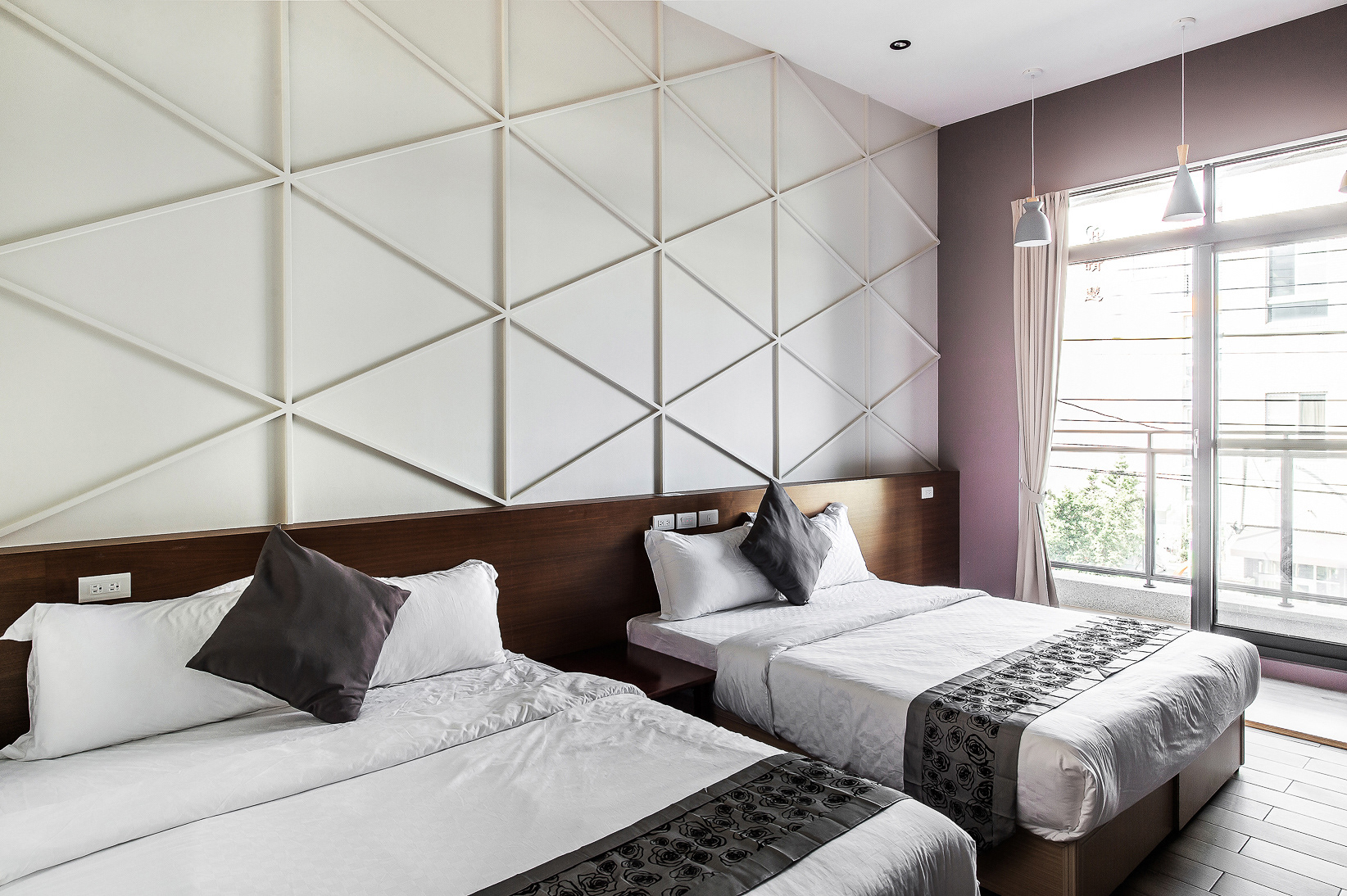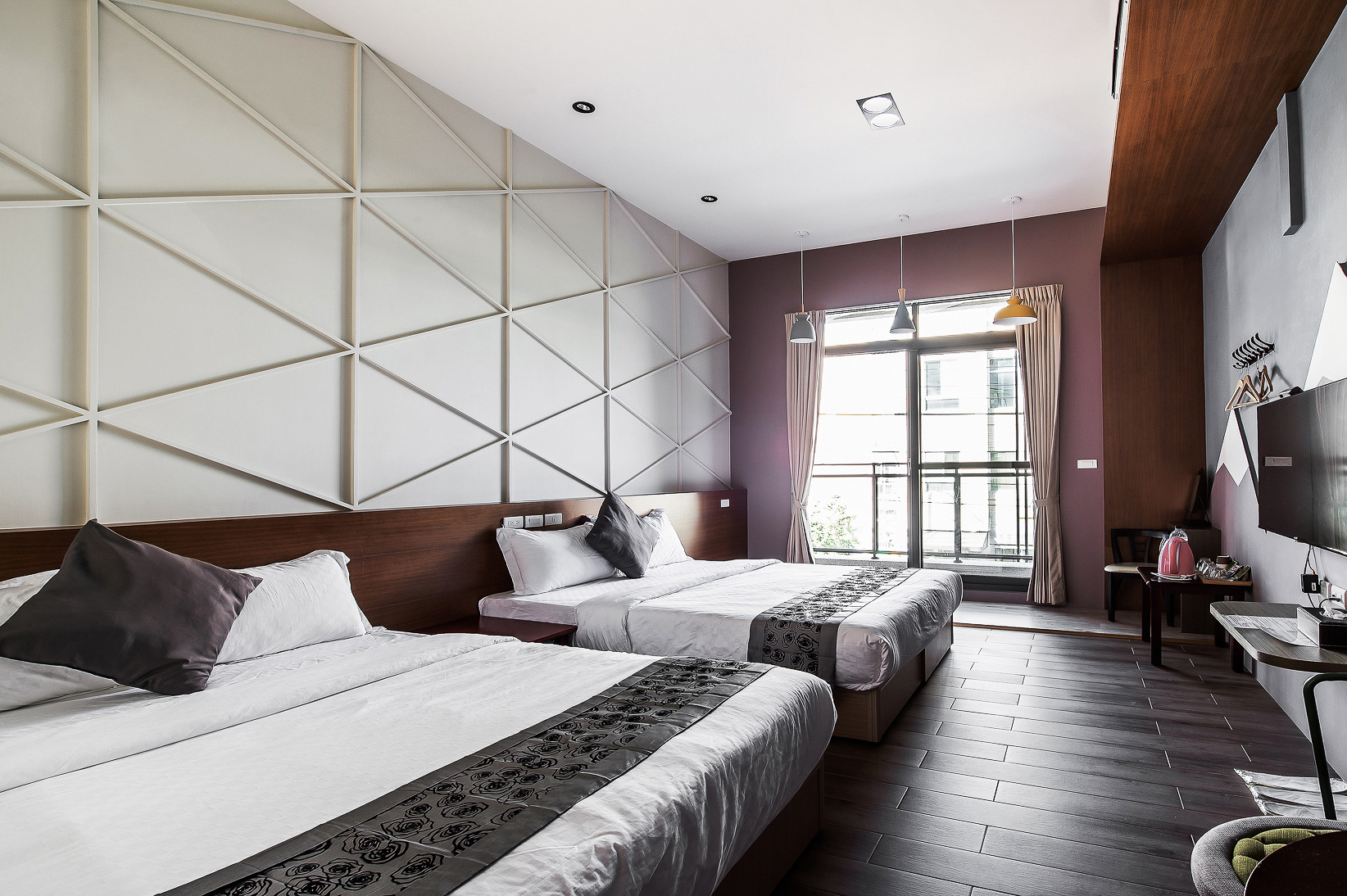 兩張加大雙人床、落地窗、陽台、私人衛浴(乾濕分離)、冷氣、液晶電視、電熱水壺、吹風機、免費WIFI