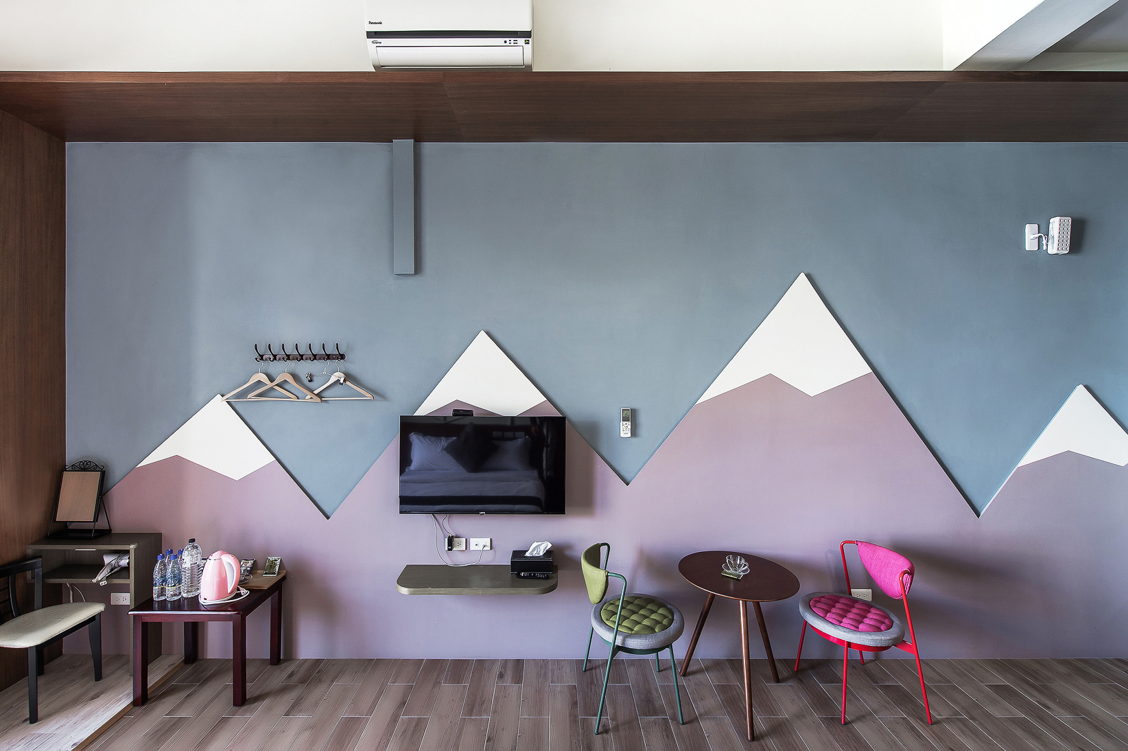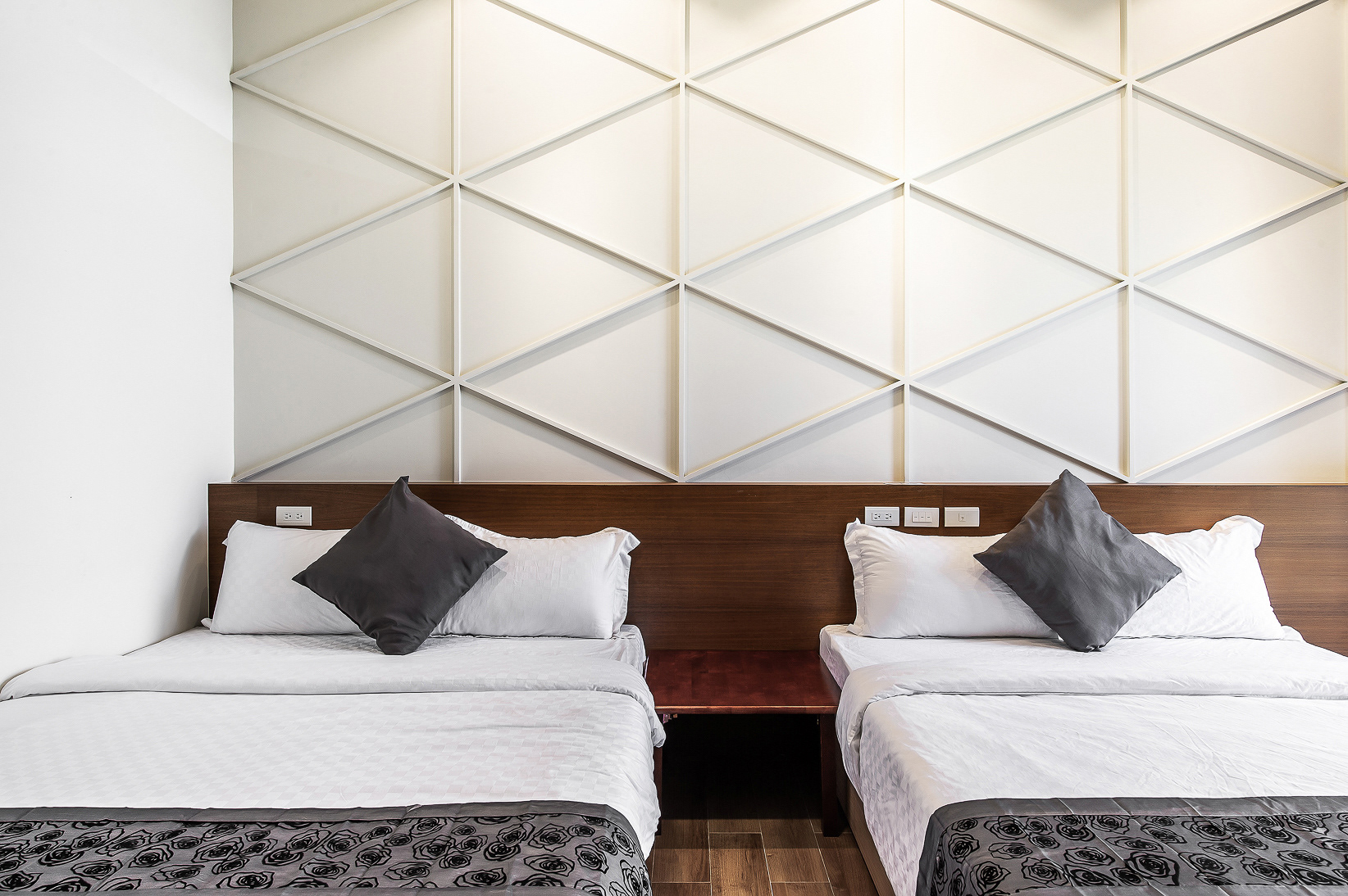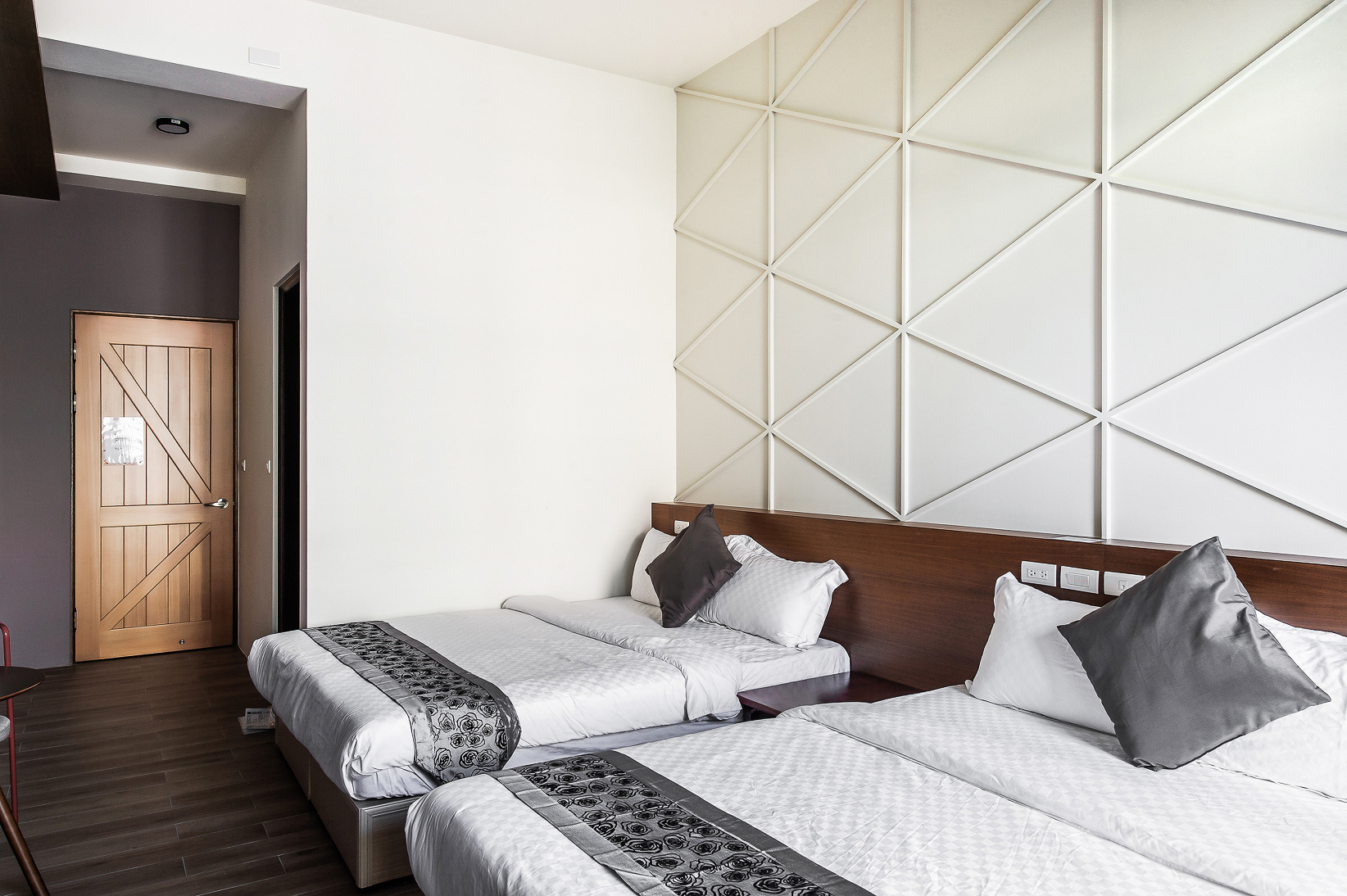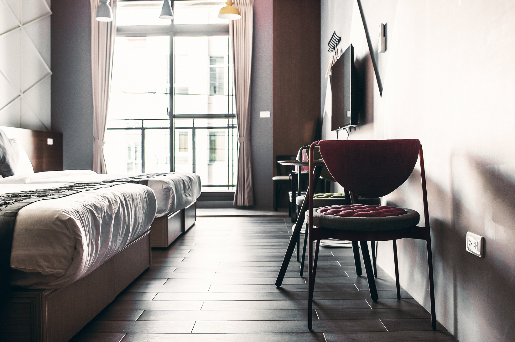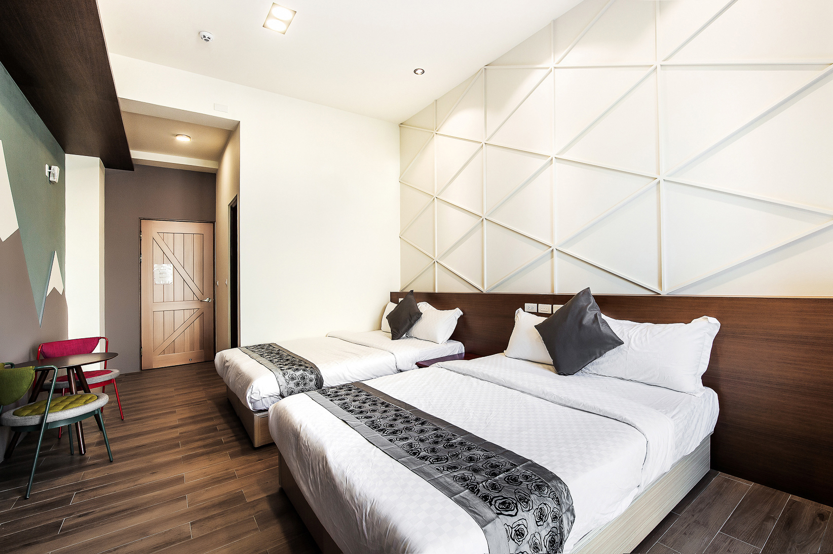 兩張加大雙人床、落地窗、陽台、私人衛浴(乾濕分離)、冷氣、液晶電視、電熱水壺、吹風機、免費WIFI