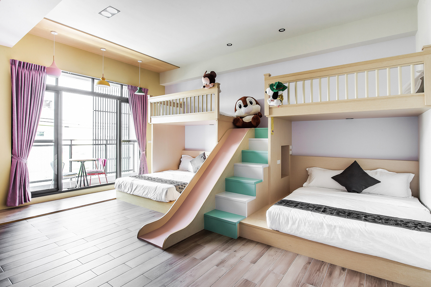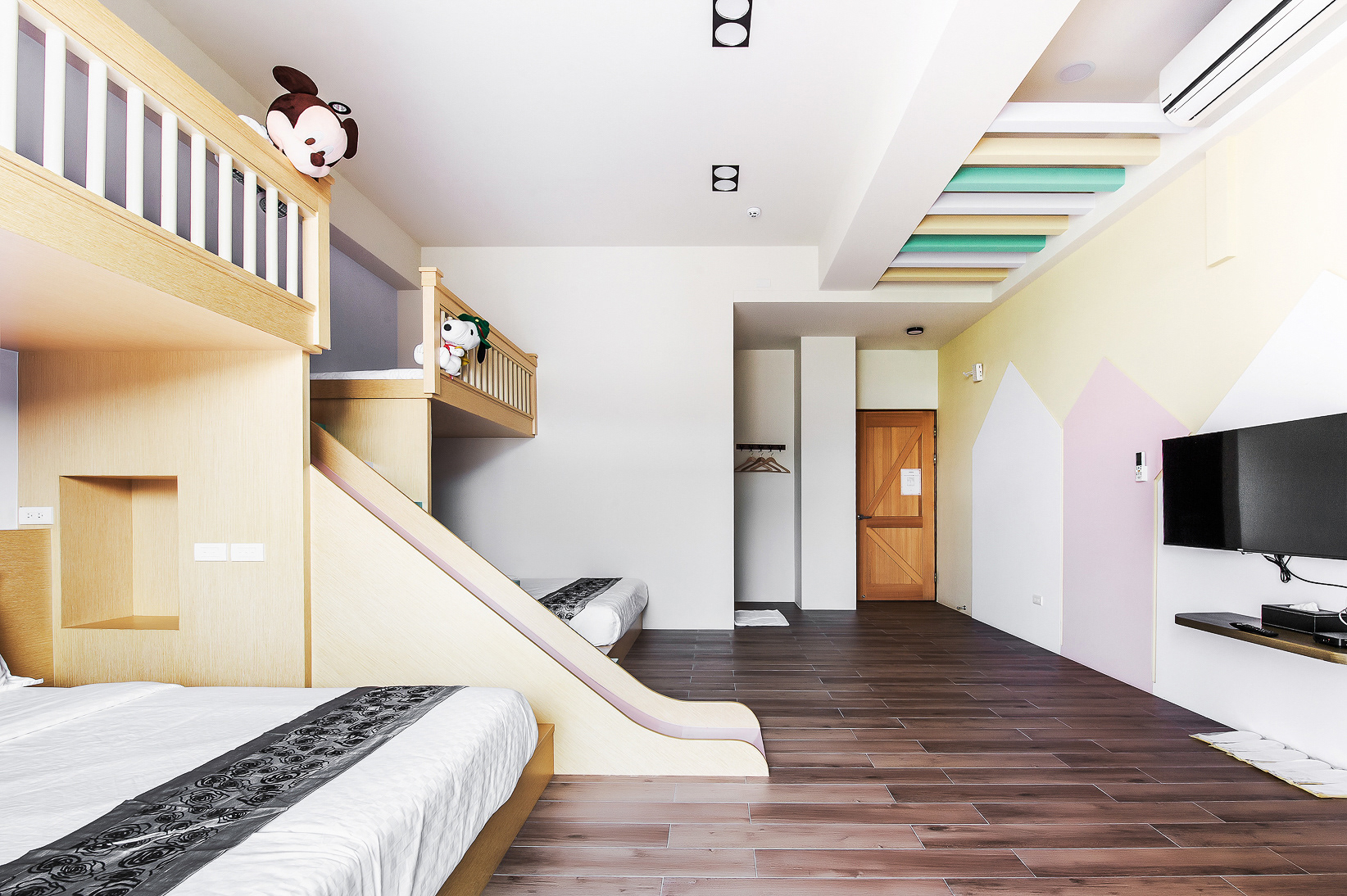 兩張標準雙人床+兩張單人床、落地窗、陽台、私人衛浴(乾濕分離)、冷氣、液晶電視、電熱水壺、吹風機、免費WIFI、兒童遊戲滑梯